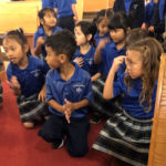 - St. Elizabeth School kindergartener Journey Richardson kneels next to first grader Ryden Antolin and teacher Grace Fowler during Ash Wednesday Mass on Feb. 26. HCH Photo | Anna Weaver