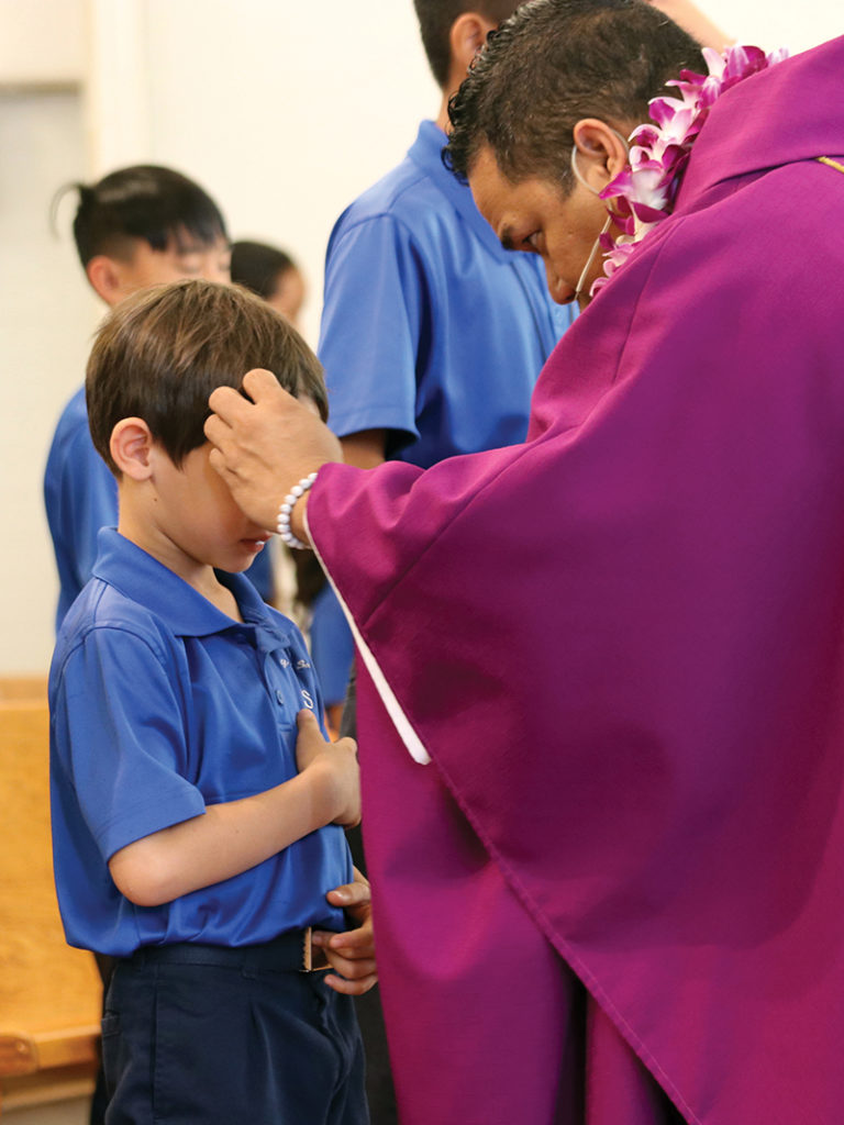 Arie Swynenberg, a second grader at St. Elizabeth School in Aiea, receives ashes from St. Elizabeth’s parochial vicar, Father Romple Emwalu, at the school’s Ash Wednesday Mass, Feb. 26. (HCH photo |Anna Weaver)