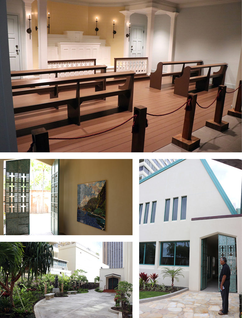 Clockwise from top: The chapel in the Damien and Marianne of Molokai Education Center includes a replica of the altar and pews at St. Philomena Church in Kalawao, Molokai. Father Lane Akiona stands in front of the new education center. The courtyard behind the building. One of the remembrance tile mosaics near the entrance of the center. (HCH Photos | Anna Weaver)