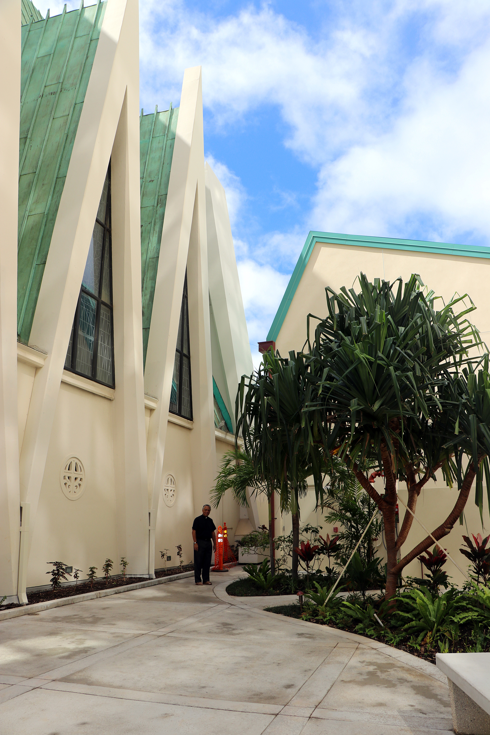 Sacred Hearts Father Lane Akiona stands In the new courtyard looking toward St. Augustine Church on the left and the education center on the right. (HCH Photo: Anna Weaver)