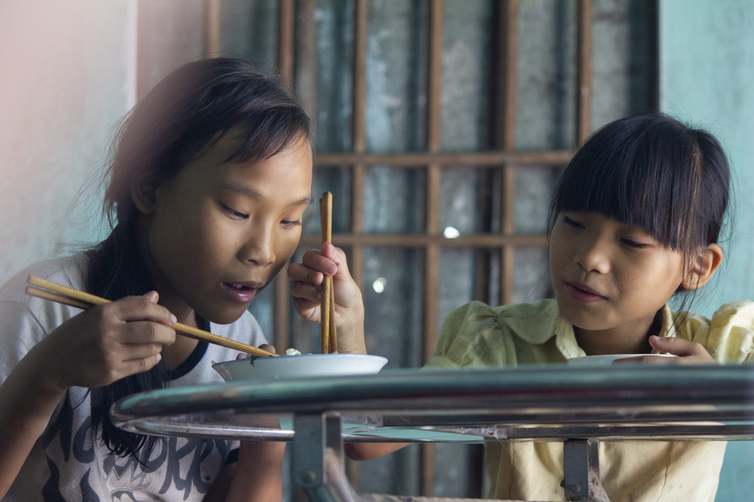 Sisters Nguyen Thi Trinh (12) and Nguyen Thi Trang (9) share breakfast in their home. (Photo by Eric Clayton/Catholic Relief Services)