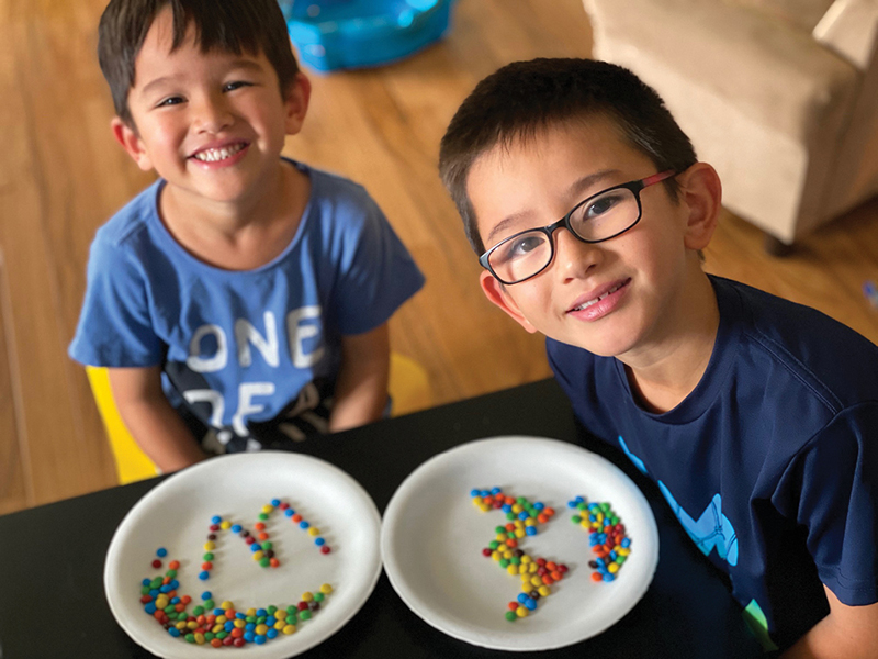 Holy Family Catholic Academy early learning center student Christian Lee worked on learning the number 22 and letter W by counting out M&M’s with the help of his brother Greysen. (Photo courtesy Kristina Lee)