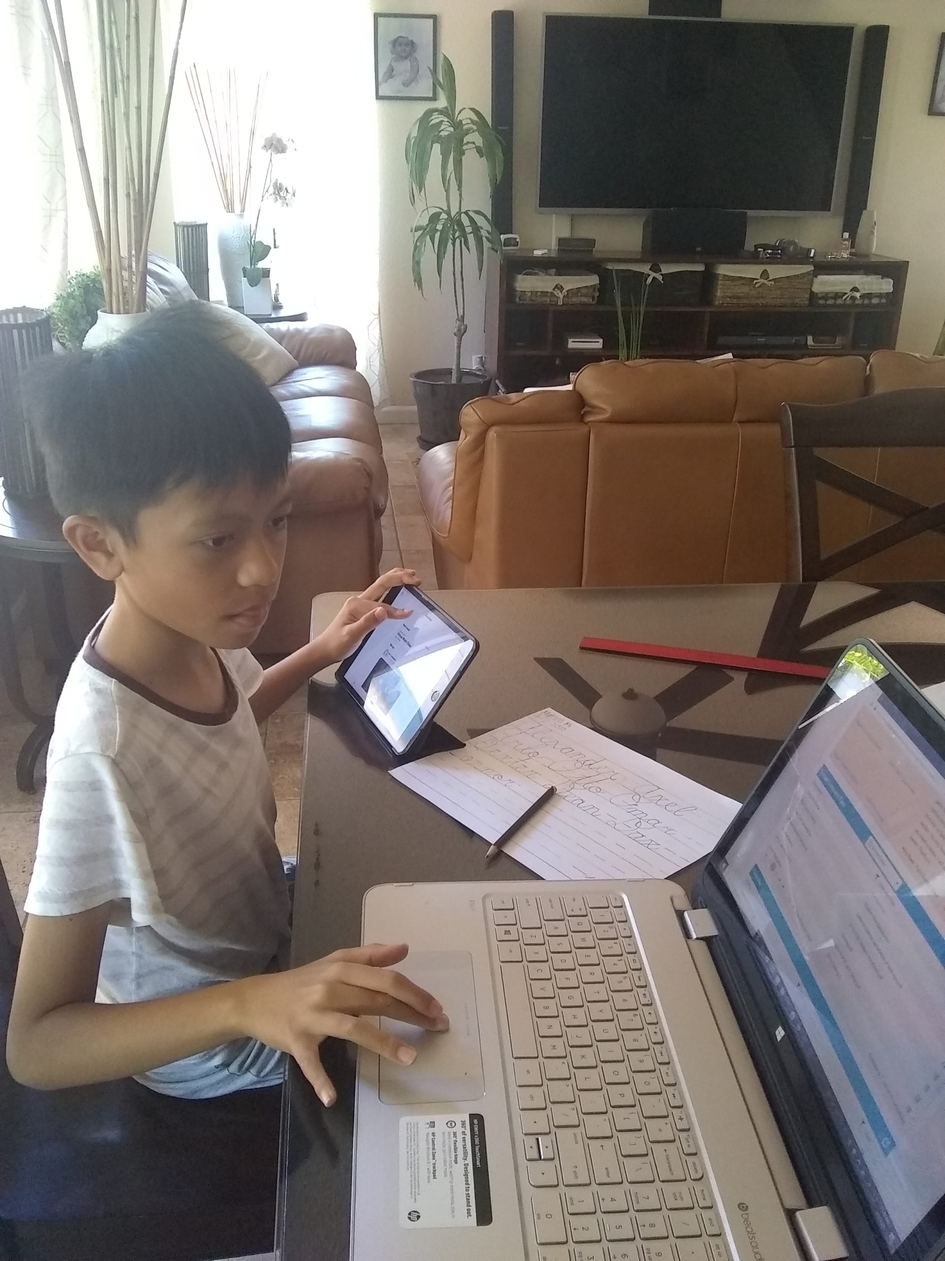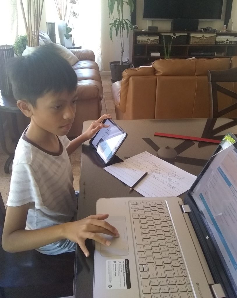 St. Theresa School, Honolulu, student Matteo Matahum works on his handwriting at his dining table. (Photo courtesy Chris Matahum)
