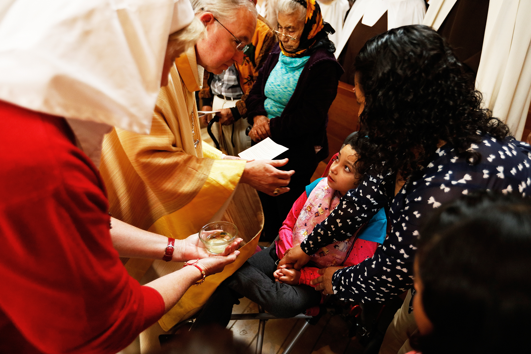 Los Angeles Archbishop Jose H. Gomez prays over a child during the Anointing of the Sick Feb. 13 at the Cathedral of Our Lady of the Angels in Los Angeles. (CNS photo/Victor Aleman, Vida-Vueva.com)