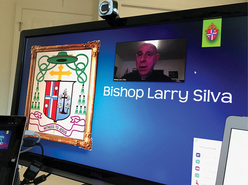 This year’s “Bagels with Bishop” event for Saint Louis School seniors was a “Stay at Home” version due to the COVID-19 virus pandemic. On April 7, the students logged in to videoconference with Bishop Larry Silva instead of meeting with him in person. Each year, Bishop Silva meets with each senior class of Hawaii’s Catholic high schools for a light breakfast, faith sharing, and questions and answers. Sadly, there were no bagels eaten virtually this year. (Photo courtesy Lisa Gomes )