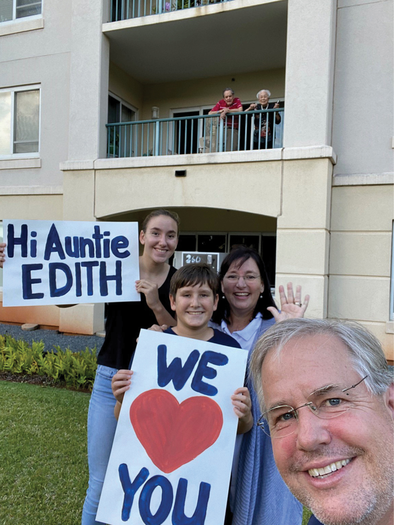 The family of Sue Ferandin, director of the Augustine Educational Foundation, dropped by April 1 for a socially distanced visit to Edith Leong and Manny Sylvester at the Kahala Nui retirement community in Waialae-Kahala. “We got a little creative,” Ferandin said. “They aren’t allowed any visitors and we wanted to share a little love with them.” Leong, who recently turned 95, has been a generous supporter of the foundation, which provides scholarships to Hawaii Catholic school students, for more than 30 years. Pictured are Sylvester and Leong on the balcony and the Ferandin family, Catie, Jack, Sue and John. (Photo courtesy of Sue Ferandin )