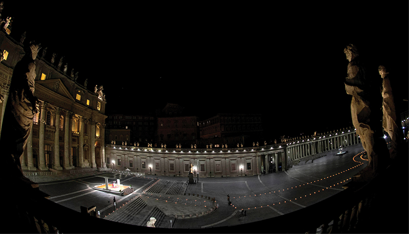 Pope Francis leads the Via Crucis procession in St. Peter’s Square at the Vatican April 10, 2020. The Good Friday service was held with no public participation because of the COVID-19 pandemic. (CNS photo/Claudio Peri, pool via Reuters)