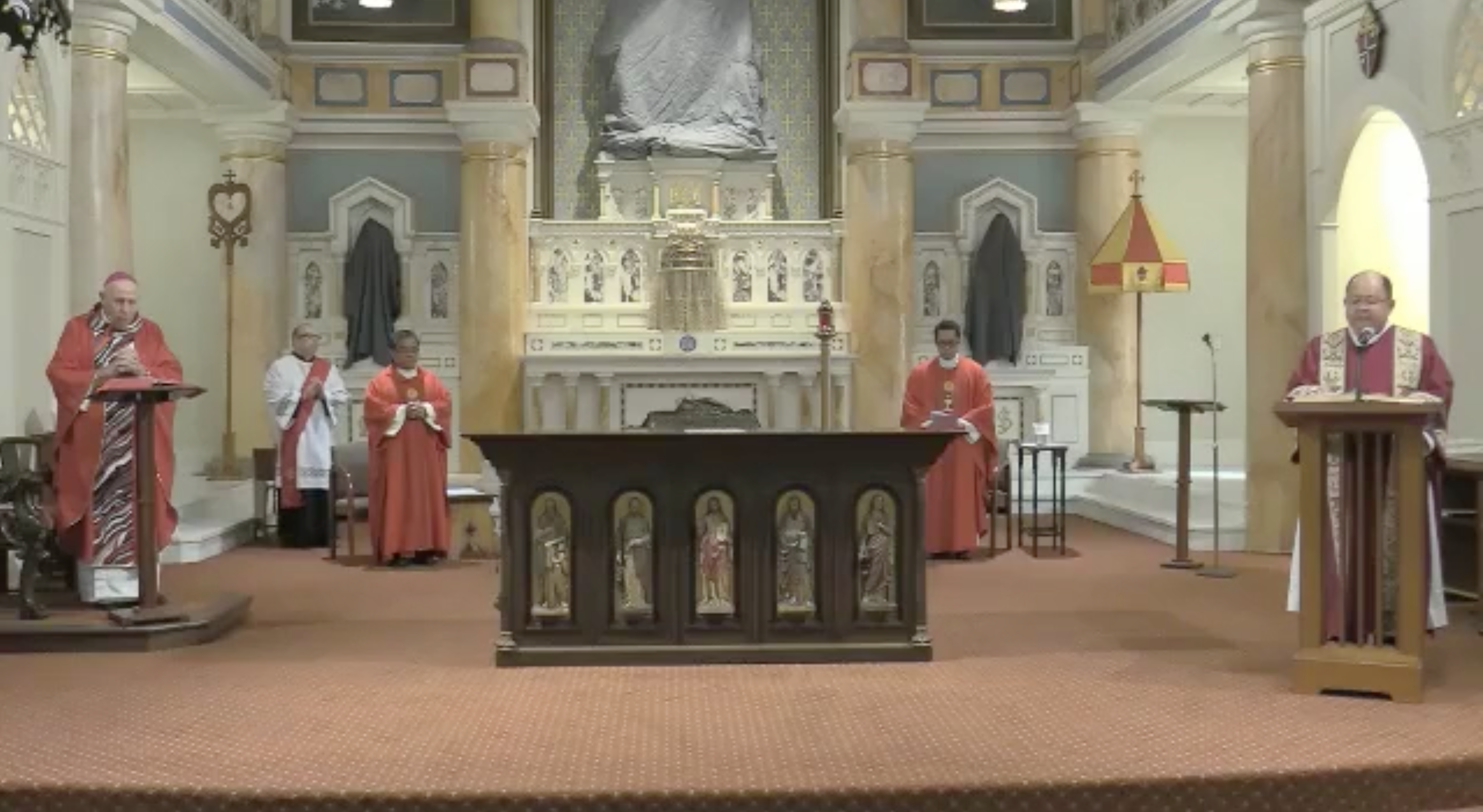 Deacon Modesto Cordero can be seen second from left during this year’s Good Friday service on a livestream feed. (Screenshot)