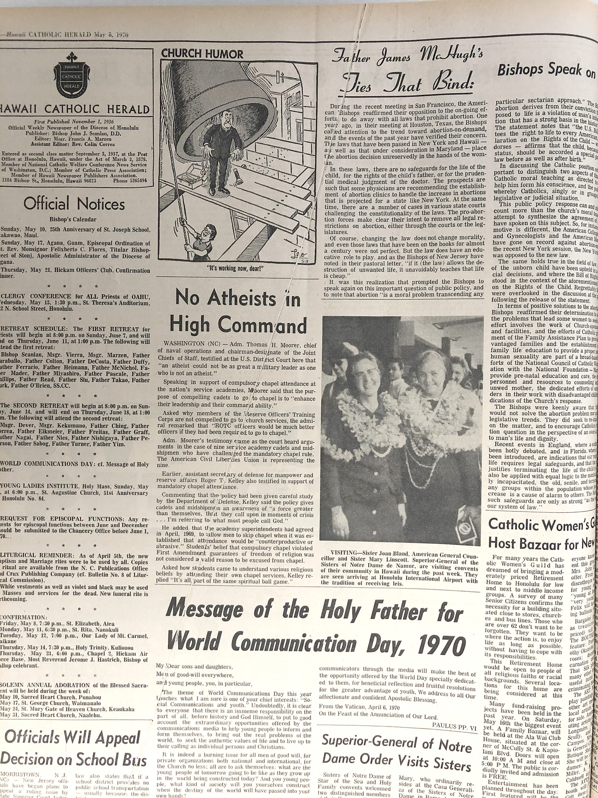 VISITING — At left, Sister Joan Bland, American General Councillor and Sister Mary Linscott, Superior-General of the Sisters of Notre Dame de Namur, are visiting convents of their community in Hawaii during the past week. They are seen arriving at Honolulu International Airport with the tradition of receiving leis.