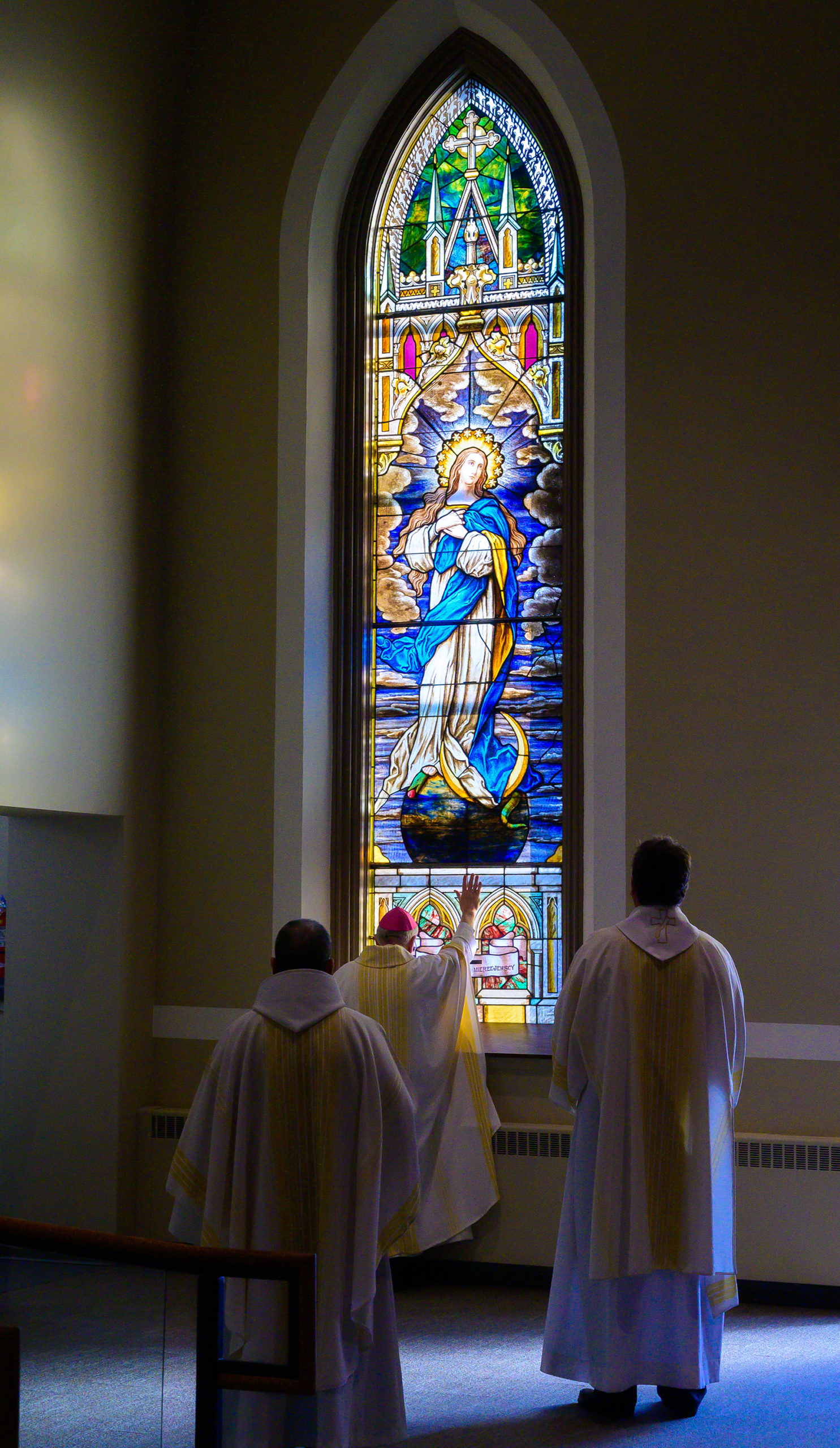 Bishop David L. Ricken of Green Bay, Wis., places his hand on a stained glass window of the Blessed Mother as the Immaculate Conception during a rededication of St. Mary of the Angels Church in Green Bay on Feb. 22, 2020. Bishops of the U.S. and Canada will consecrate their nations to Mary on May 1. (CNS photo/Sam Lucero, The Compass)