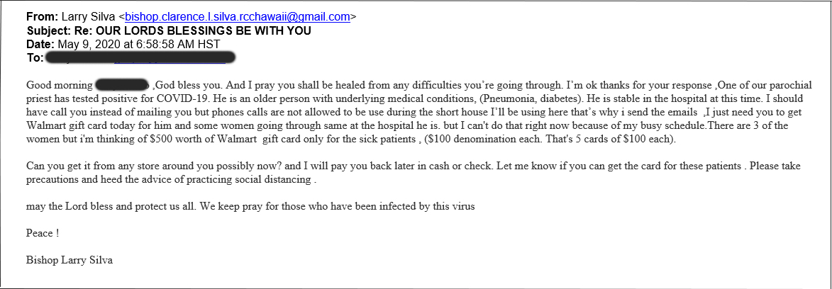 While the incorrect grammar, poor punctuation and capitalization, and other inconsistencies in the message might tip a recipient off, the missives come from email addresses that can look legitimate at first glance. The above email was sent from bishop.clarence.l.silva.rcchawaii@gmail.com. Other times, scammers will use a display name that says it’s an rrchawaii.org address, but when the address is hovered over or clicked on to expand it, the actual email is from an unofficial source and not a Roman Catholic Church Hawaii (rcchawaii) address.