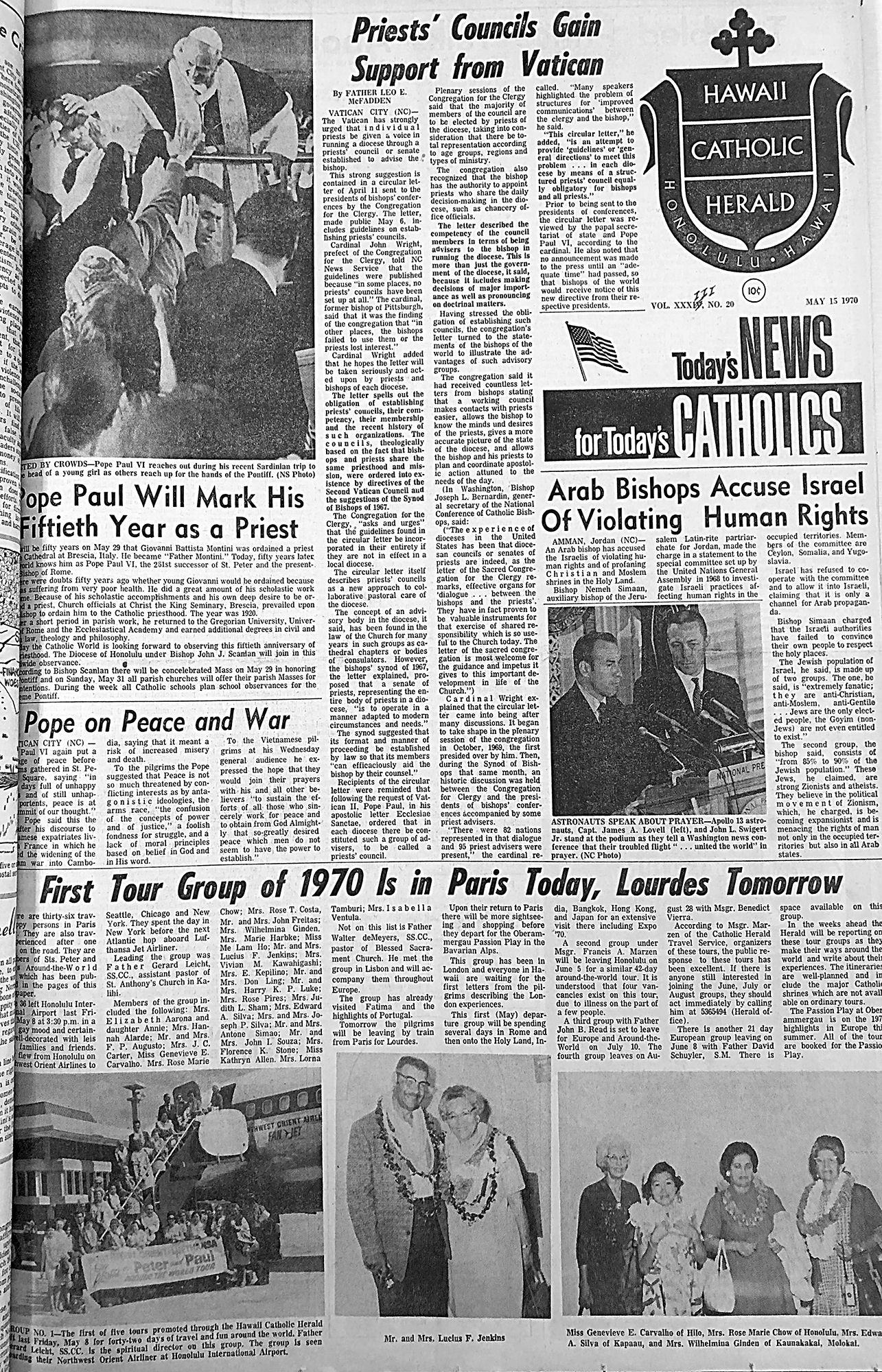 Left, the first of five tours promoted through the Hawaii Catholic Herald left last Friday, May 8, for forty-two days of travel and fun around the world. Father Gerard Leicht, SS.CC., is the spiritual director on this group. The group is seen boarding their Northwest Orient Airliner at Honolulu International Airport.