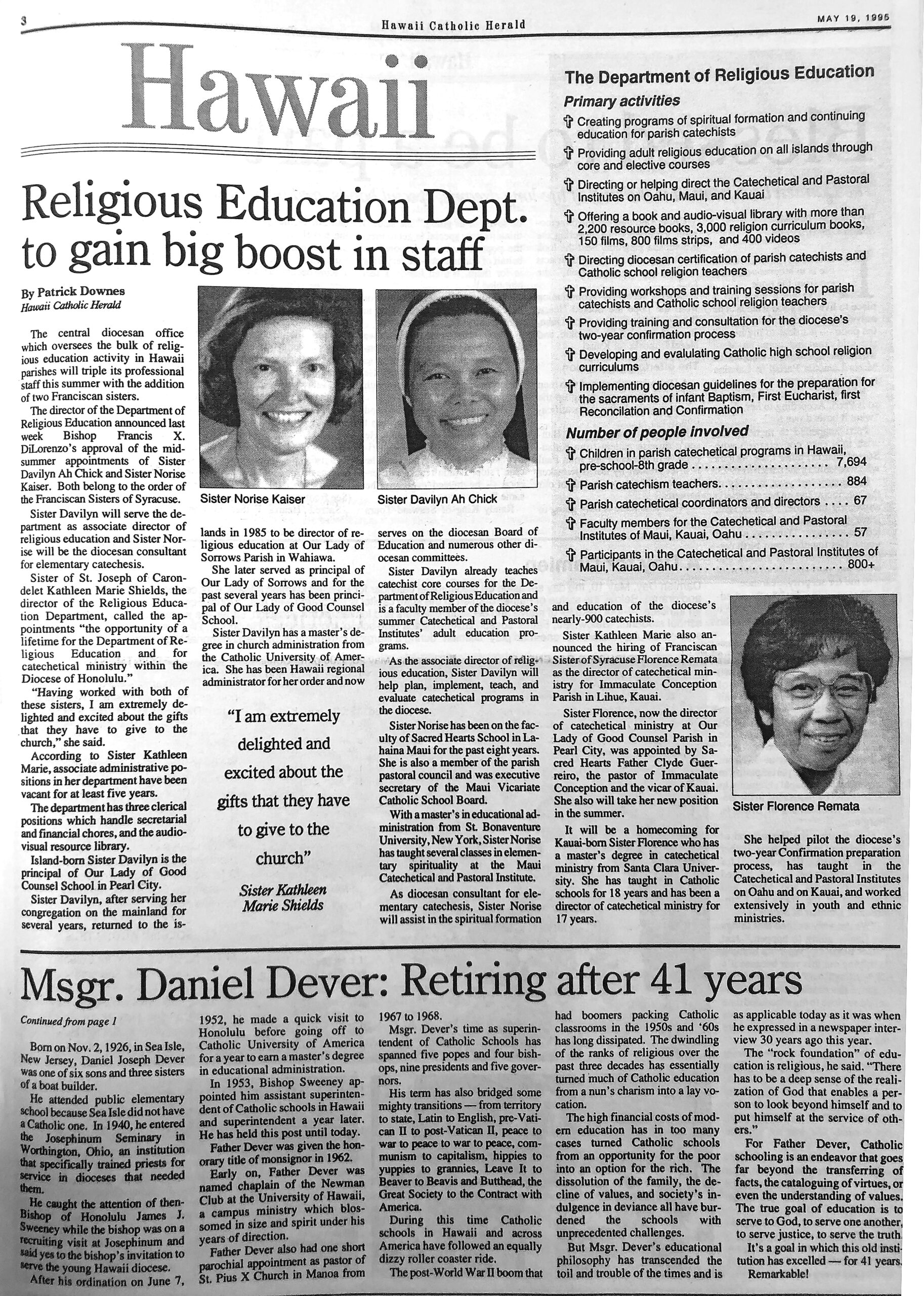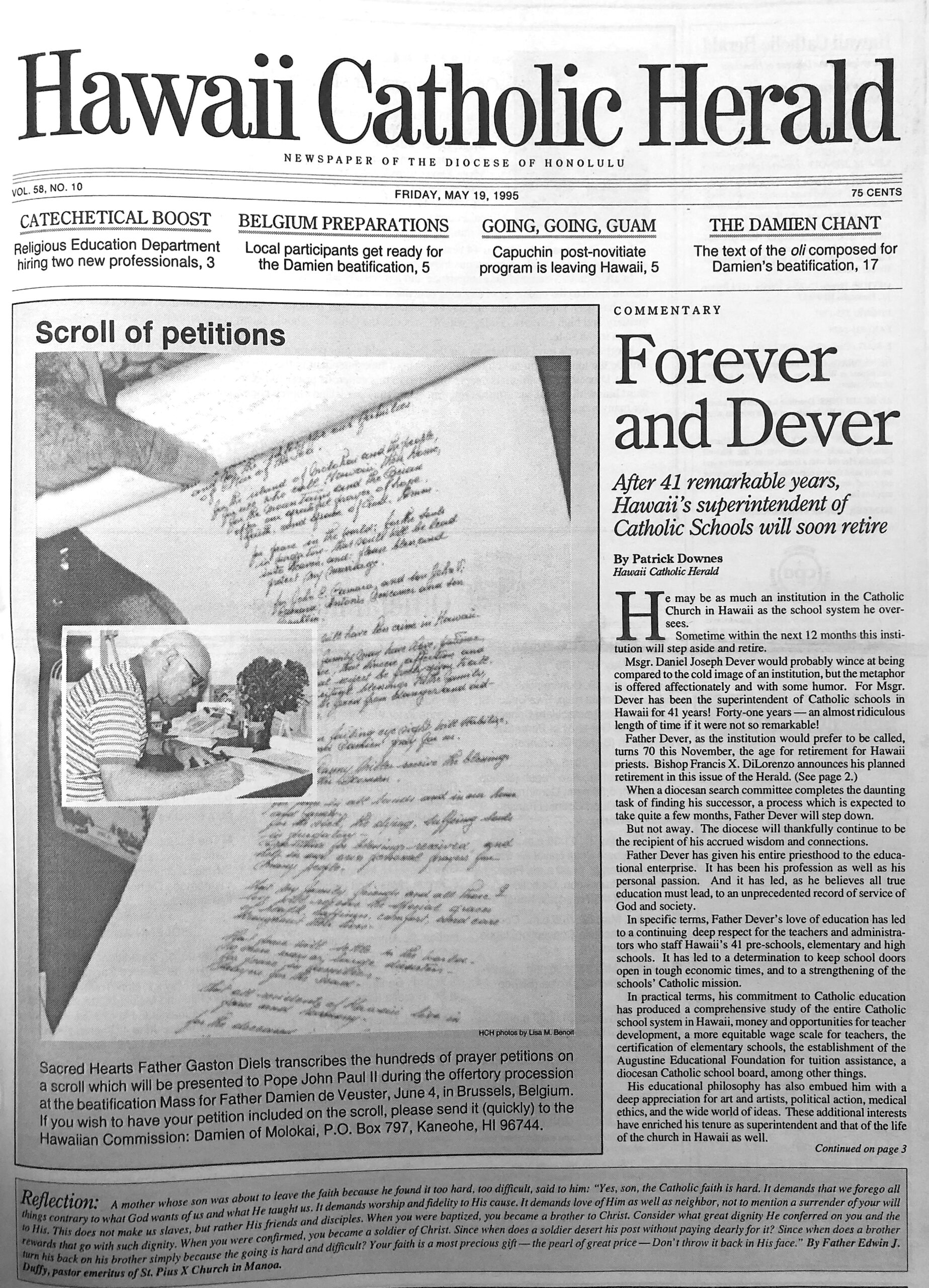 Msgr. Daniel Joseph Dever would probably wince at being compared to the cold image of an institution, but the metaphor is offered affectionately and with some humor. For Msgr. Dever has been the superintendent of Catholic schools in Hawaii for 41 years! Forty-one years – an almost ridiculous length of time if it were not so remarkable!