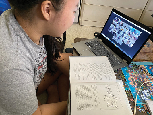 One upside to online classes for senior Chanah Tanioka is that her teachers let students eat lunch in class since they are on “mute” and no one can hear them eating. A downside, she said, is that you’re staring at a screen all day.