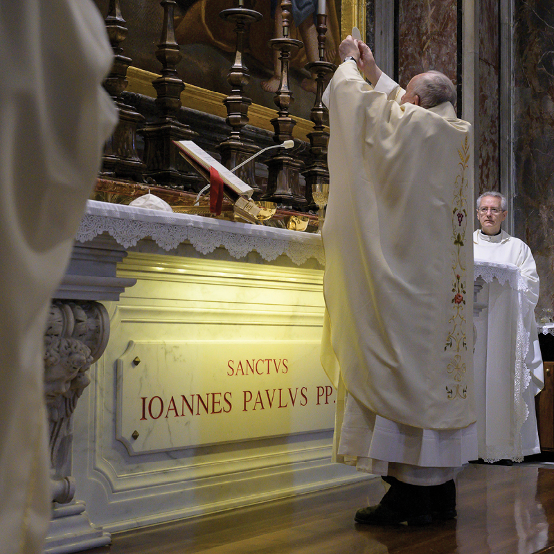 Pope Francis elevates the host during Mass at the tomb of St. John Paul II in St. Peter’s Basilica May 18, the 100th anniversary of the late pope’s birth. (CNS photo/Vatican Media)