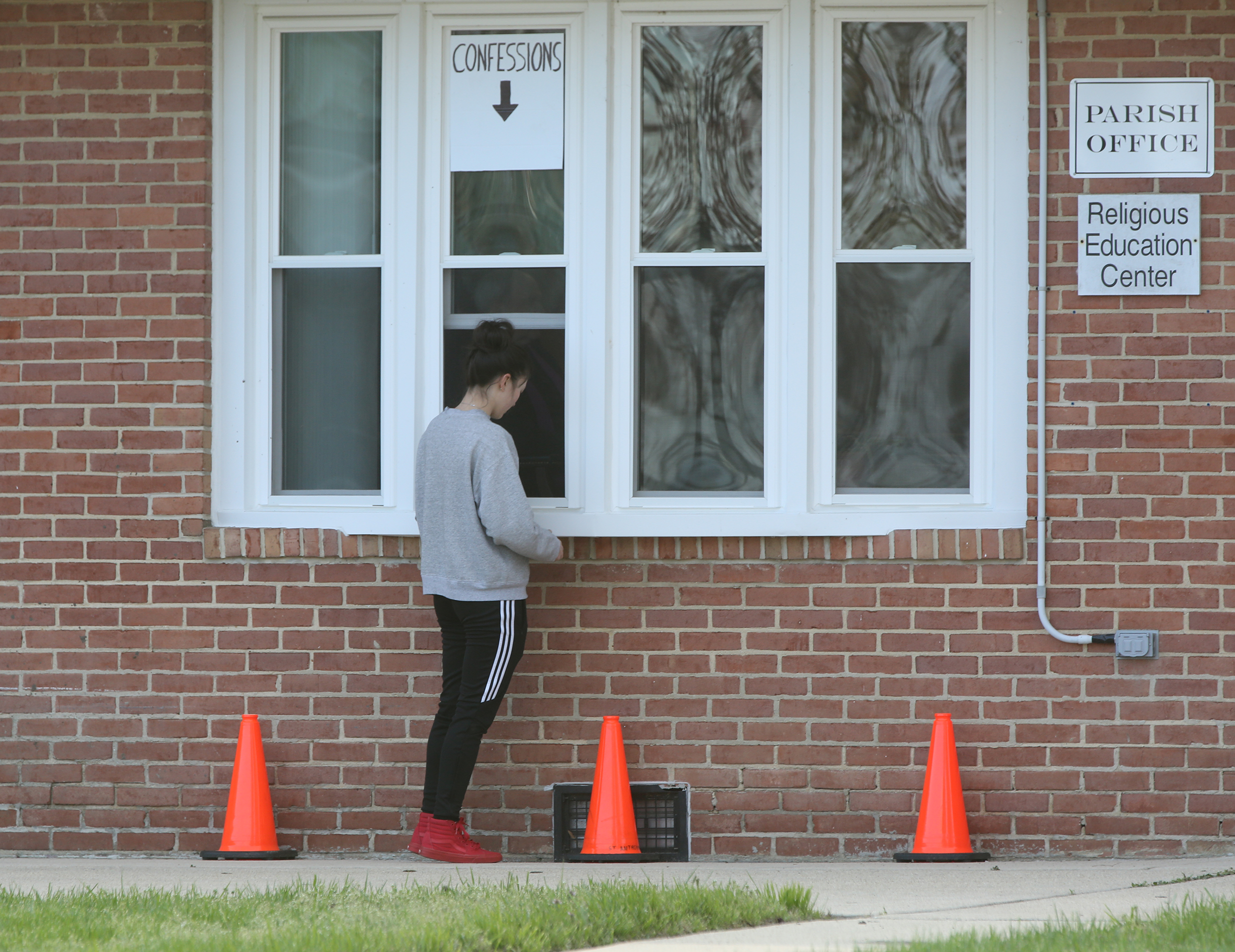 A young woman goes to confession at a window outside St. Anthony’s Catholic Church in North Beach, Md., April 1, 2020, during the coronavirus pandemic. (CNS photo/Bob Roller)