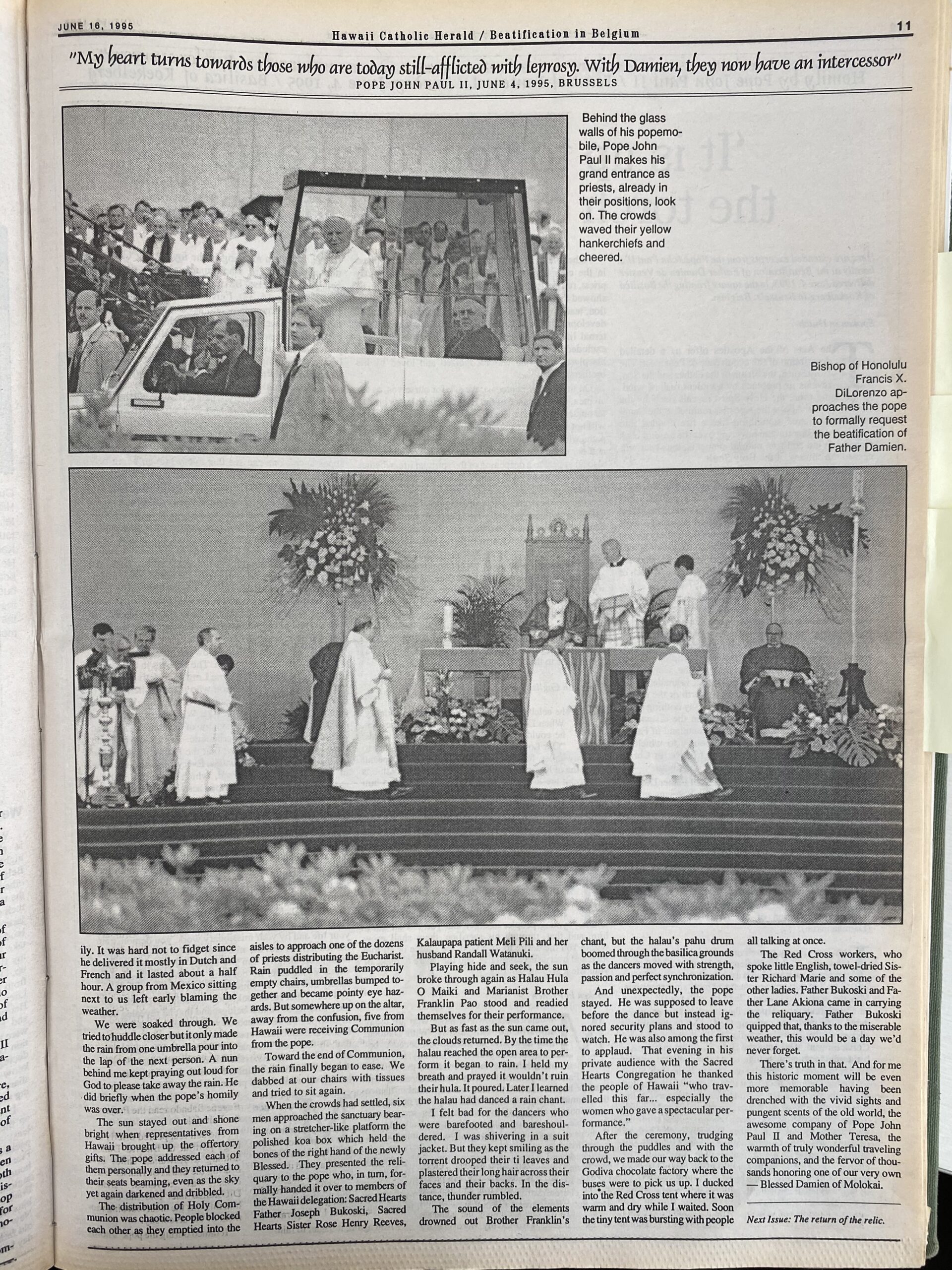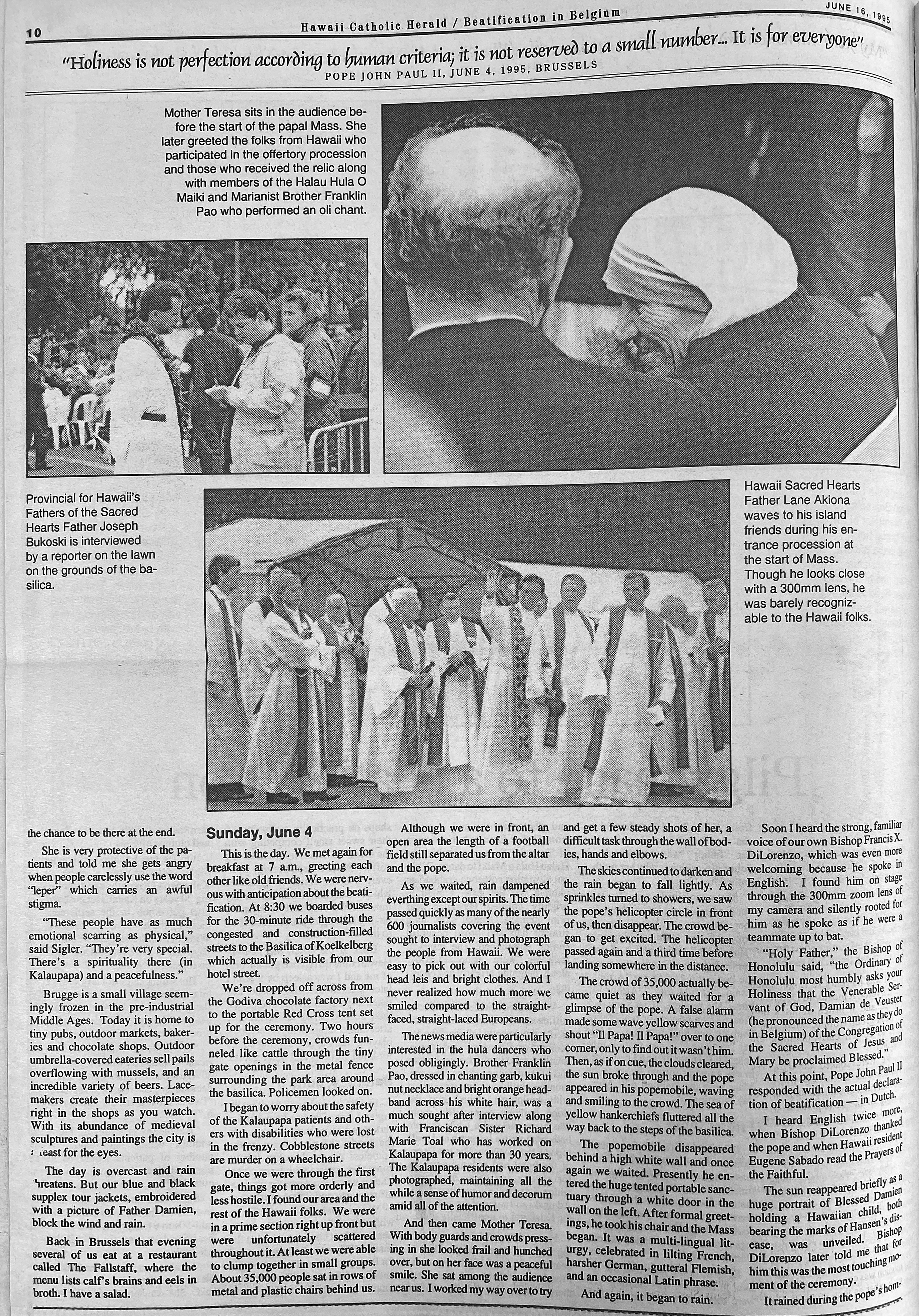 More than 35,000 people from all over the world surround the Basilica of Koelkelberg in Brussels, Belgium, June 4 for the beatification Mass of Father Damien. … Mother Teresa was spotted sitting in the audience before the start of the papal Mass. She later greeted the folks from Hawaii who participated in the offertory procession and those who received the relic along with members of the Halau Hula O Maiki and Marianist Brother Franklin Pao, who performed an oli chant.