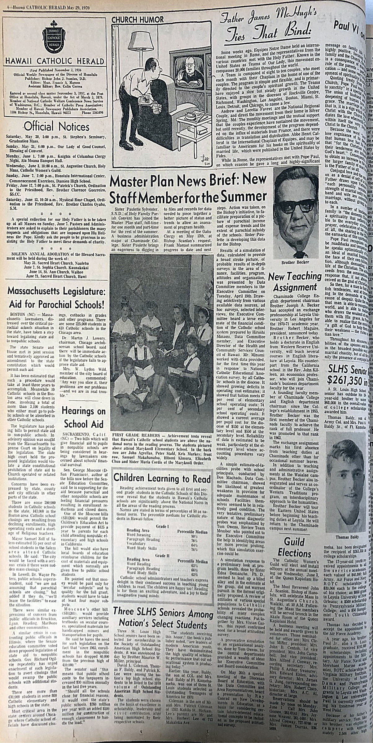 FIRST GRADE READERS – Achievement tests reveal that Hawaii’s Catholic school students are above the national norm in the reading process. The students pictured above attend Maryknoll Elementary School. In the back row are John Agrellas, Peter Stahl, Kris Markey; front row, Samuel Makahanaloa, Hitomi Kimura, Elizabeth Chun and Sister Maria Cordis of the Maryknoll Order.