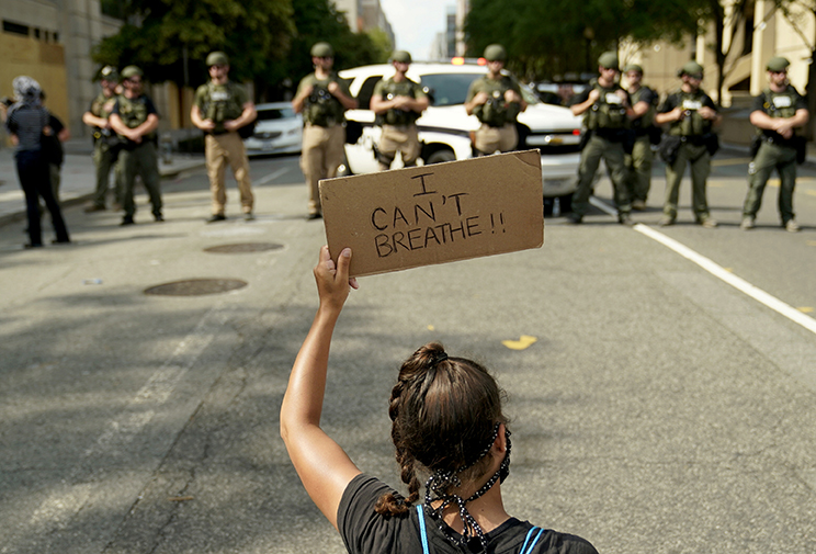 A woman in Washington holds a placard near law enforcement officers June 6, 2020. Demonstrations continue after a white police officer in Minnesota was caught on a bystander’s video May 25 pressing his knee into the neck of George Floyd, an African American, who was later pronounced dead at a hospital. (CNS photo/Erin Scott, Reuters)