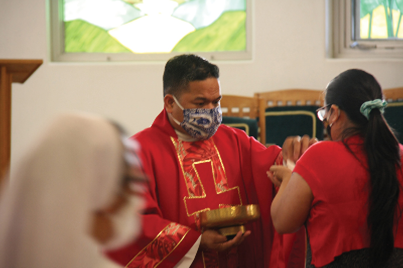 Father Romple Emwalu distributes Holy Communion at the 5:30 p.m. Mass May 30 at St. St. Elizabeth Church, Aiea. (HCH photo | Patrick Downes)