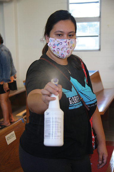 Ashley Duenas sanitizes pews in St. Elizabeth Church after Mass May 30. (HCH photo | Patrick Downes)