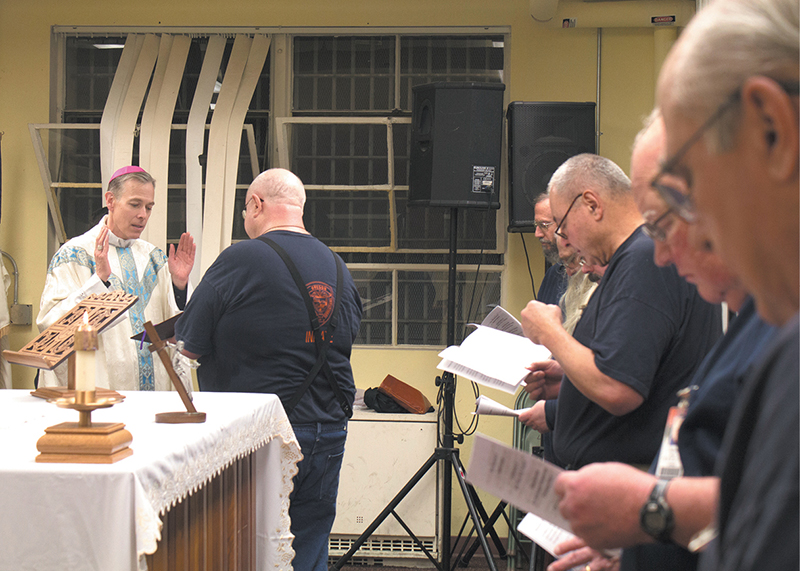 In this 2014 file photo, Archbishop Alexander K. Sample of Portland, Ore., and Hal Elkins are seen together during a Mass in the chapel at Oregon State Penitentiary. (CNS photo/Jon DeBellis, Catholic Sentinel)