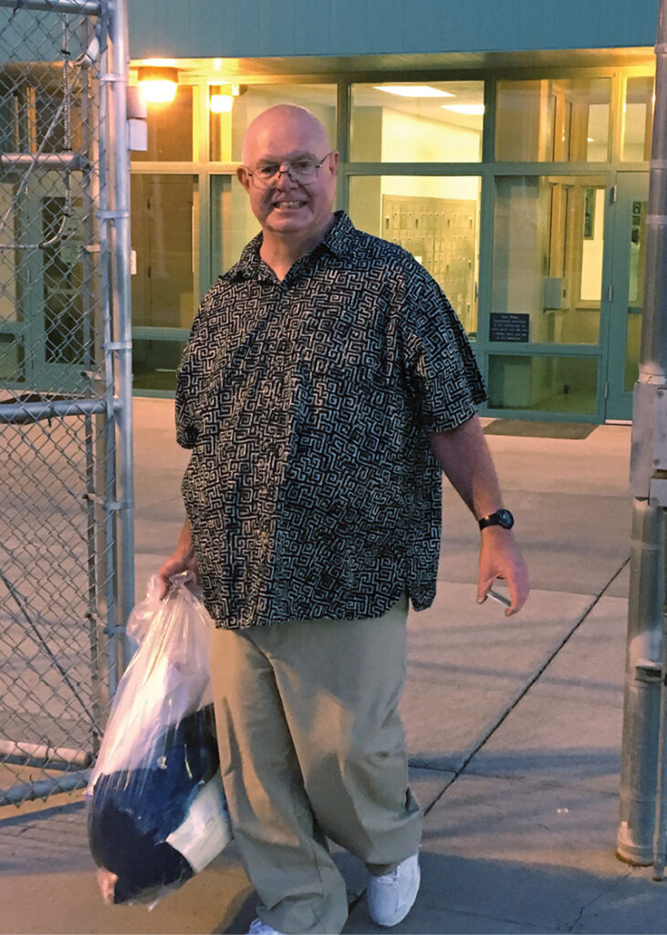 Hal Elkins smiles as he walks out of the Oregon State Penitentiary in 2018. He died of cancer nine months after being released. (CNS photo)