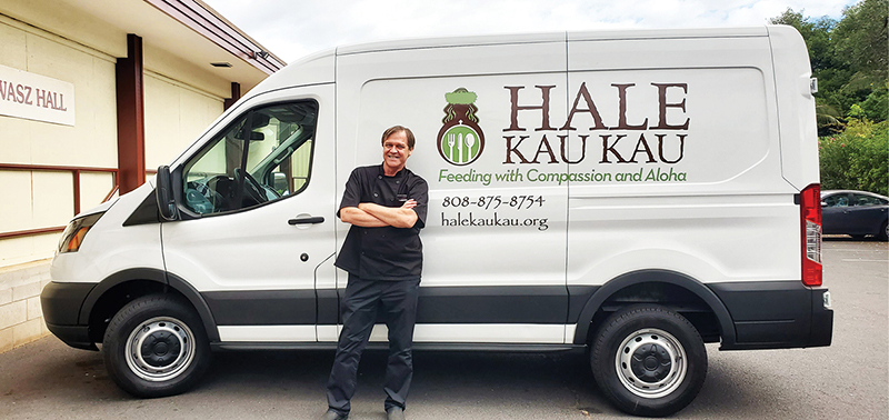 Hale Kau Kau buys food from the Maui Food Bank at a very nominal price. Grocery stores and hotels donate food as well, keeping the new van busy with pickups. The spacious vehicle is a Ford Transit E250 cargo van donated by Don and Kris Wilson, long time supporters of Hale Kau Kau.