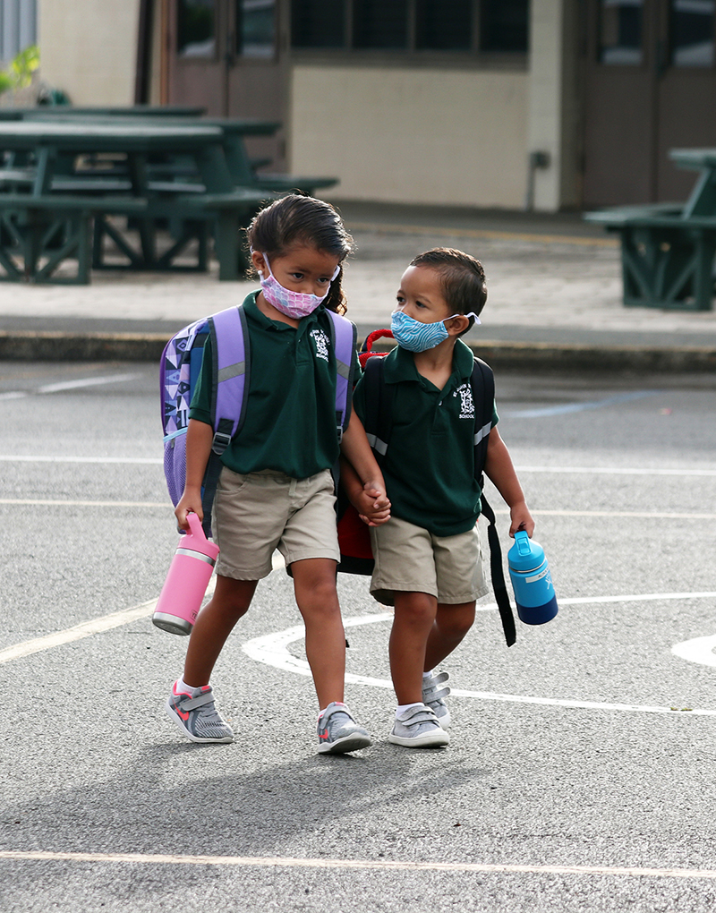 St. John Vianney School, Kailua, preschoolers and siblings Keilani and Alika Kuchler hold hands as they walk to class together on July 28, the first day of the Kailua school’s academic year. (HCH photo | Anna Weaver)