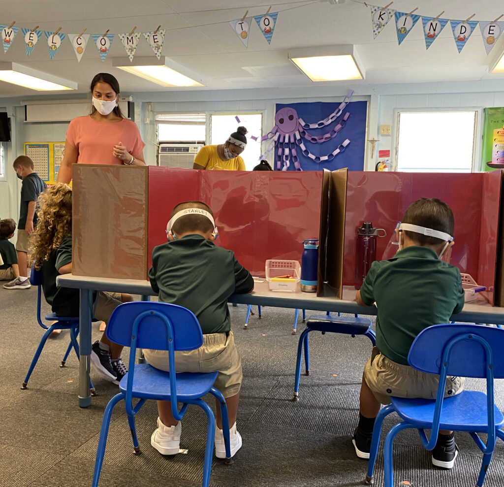 The kindergarten class at St. John Vianney made use of dividers to keep children separated. (HCH Photo: Anna Weaver)