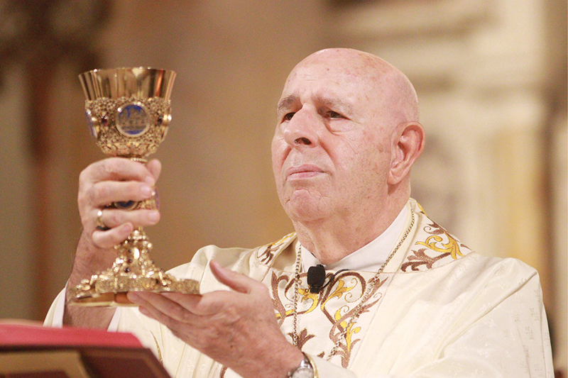Bishop Larry Silva, who turned 71 two weeks ago, continues to celebrate public Masses. Here he raises the chalice at the Mass for the 177th anniversary of the dedication of the Cathedral Basilica of Our Lady of Peace in Honolulu. (Courtesy photo by Dann Ebina)