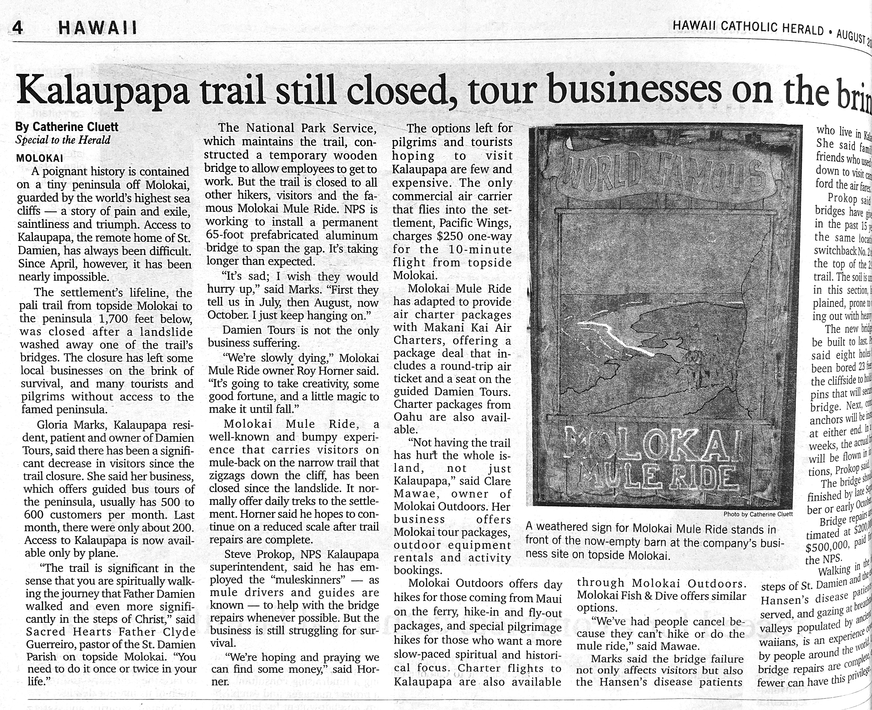 The settlement’s lifeline, the pali trail from topside Molokai to the peninsula 1,700 feet below, was closed after a landslide washed away one of the trail’s bridges. The closure has left some local businesses on the brink of survival, and many tourists and pilgrims without access to the famed peninsula. …