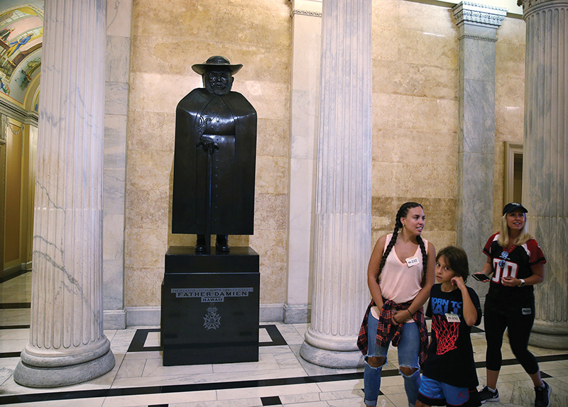 A sculpture of St. Damien of Molokai is seen at the U.S. Capitol in Washington July 6, 2017. The 19th-century Belgian missionary spent his life ministering to people with Hansen’s disease in Hawaii. (CNS photo/Tyler Orsburn)