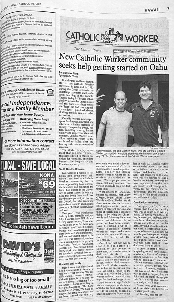 One of our first acts was to choose as our patron St. Damien…Now we are starting a Catholic Worker newspaper for the island of Oahu. We hope in the near future to be able to establish a house of hospitality for the homeless as well.