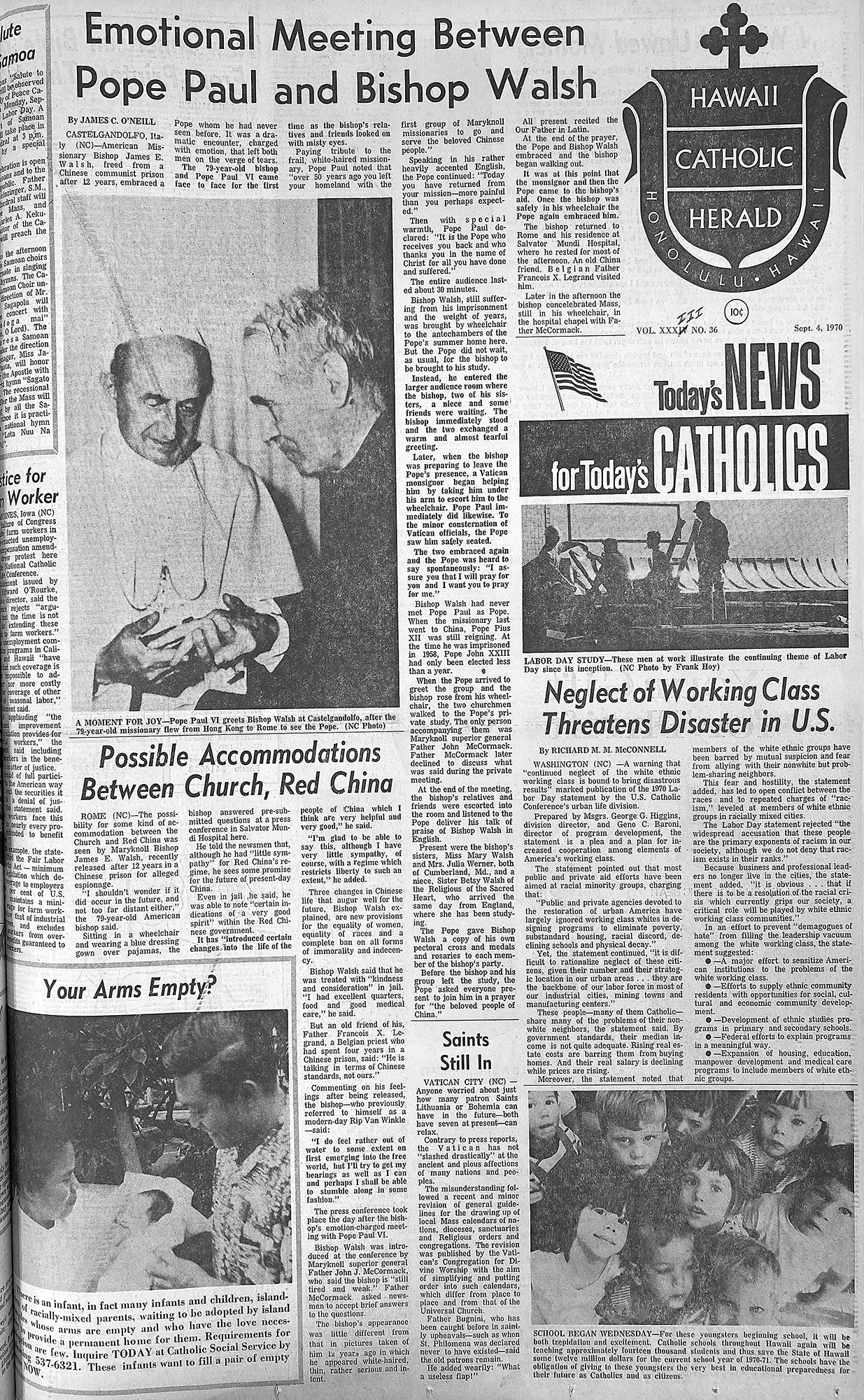 SCHOOL BEGAN WEDNESDAY – For these youngsters beginning school, it will be both trepidation and excitement. Catholic schools throughout Hawaii again will be teaching approximately 14,000 students and thus save the State of Hawaii some $12 million for the current school year of 1970-71. The schools have the obligation of giving to these youngsters the very best in educational preparedness for their future as Catholics and as citizens.