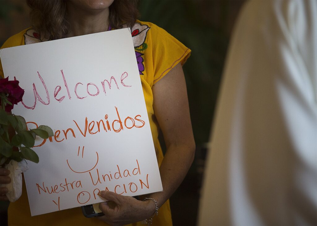 A woman presents a sign to a bishop at St. Pius X Church in El Paso, Texas, Sept. 23, 2019, during a pastoral encounter by U.S. bishops with migrants at the border. “Welcome. Our unity and prayer,” reads the sign. (CNS photo/Tyler Orsburn)
