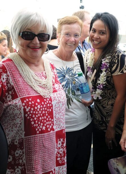 HOPE Services employees Robin Garry, Denise Oguma and Pikake Nalimu wear new masks given to them in honor of the nonprofit’s 10th anniversary. (Photo courtesy HOPE Services)
