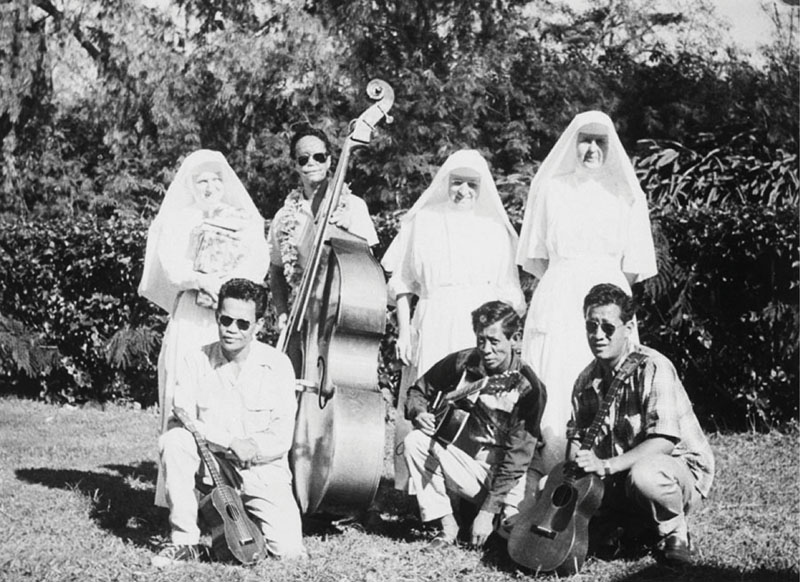 Sammy Kuahine (top row with bass) poses with some of the Sisters of St. Francis serving at Kalaupapa: Sister Wilma Halmasy, Sister Carmelita Chmelewska and Sister Rosanne LaManche; and fellow Kalaupapa musicians, from left, Willie Kupele, Orson Gallero and Henry Hatori. (Photo courtesy of St. Marianne Cope Shrine & Museum)