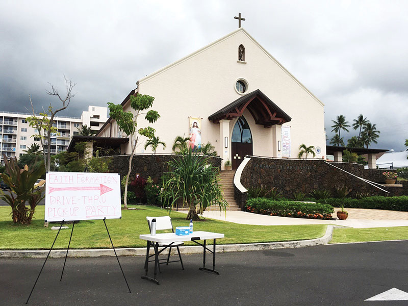 The sign points the way to the faith formation drive-thru pickup party. (Photo courtesy of St. Michael Parish, Kailua-Kona)
