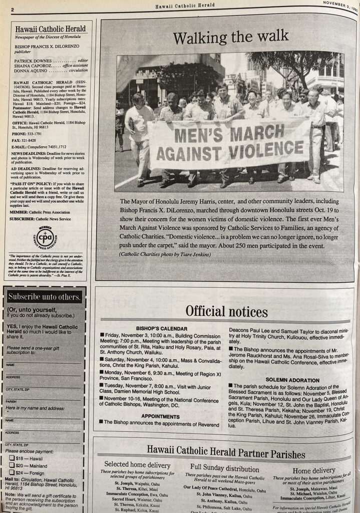 The Mayor of Honolulu Jeremy Harris, center, and other community leaders, including Bishop Francis X. DiLorenzo, marched through downtown Honolulu streets Oct. 19 to show their concern for the women victims of domestic violence. The first ever Men’s March Against Violence was sponsored by Catholic Services to Families, an agency of Catholic Charities. “Domestic violence … is a problem we can no longer ignore, no longer push under the carpet,” said the mayor. About 250 men participated in the event (Catholic Charities photo by Tiare Jenkins)