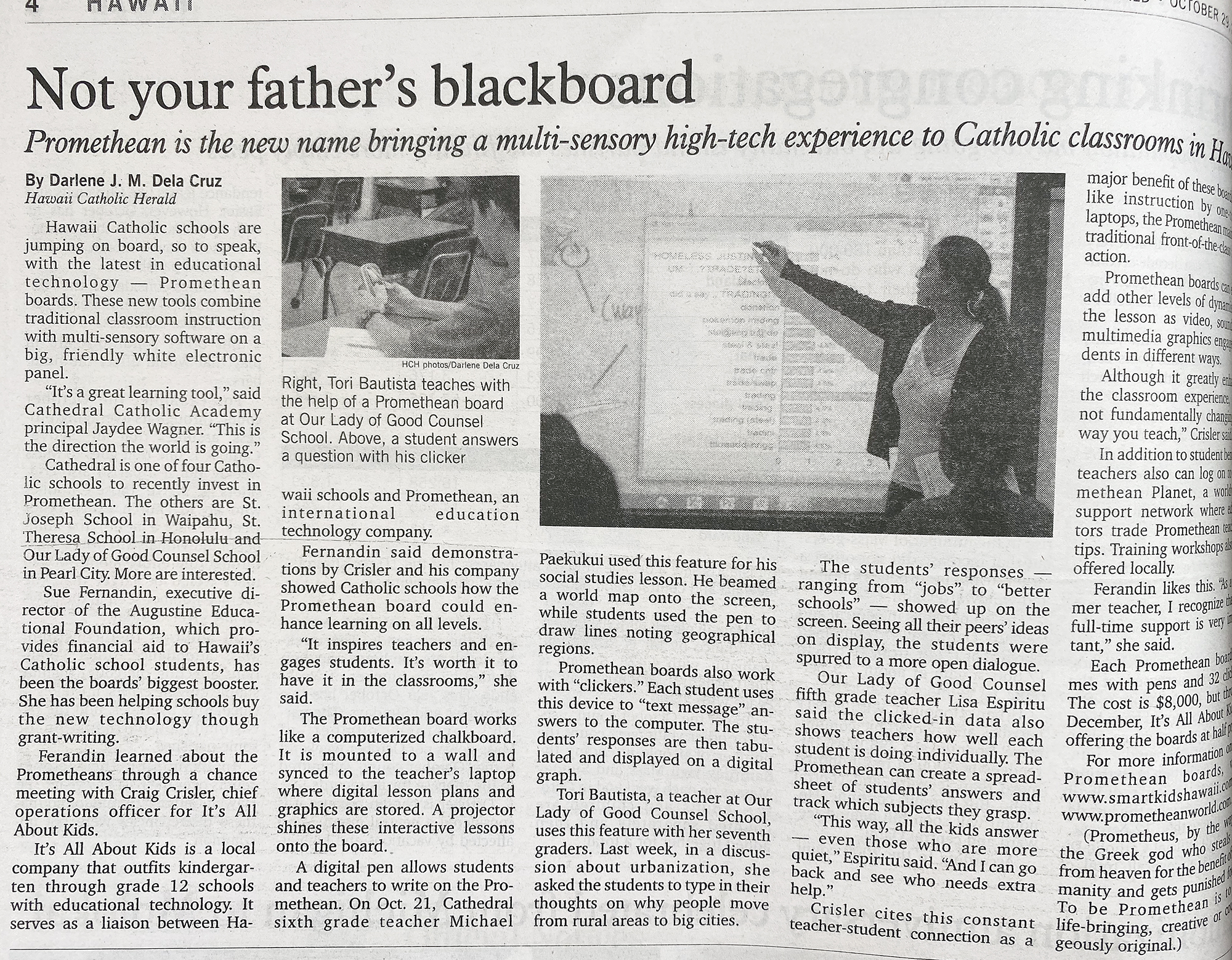 Cathedral is one of four Catholic schools to recently invest in Promethean. The others are St. Joseph School in Waipahu, St. Theresa School in Honolulu and Our Lady of Good Counsel School in Pearl City. More are interested.