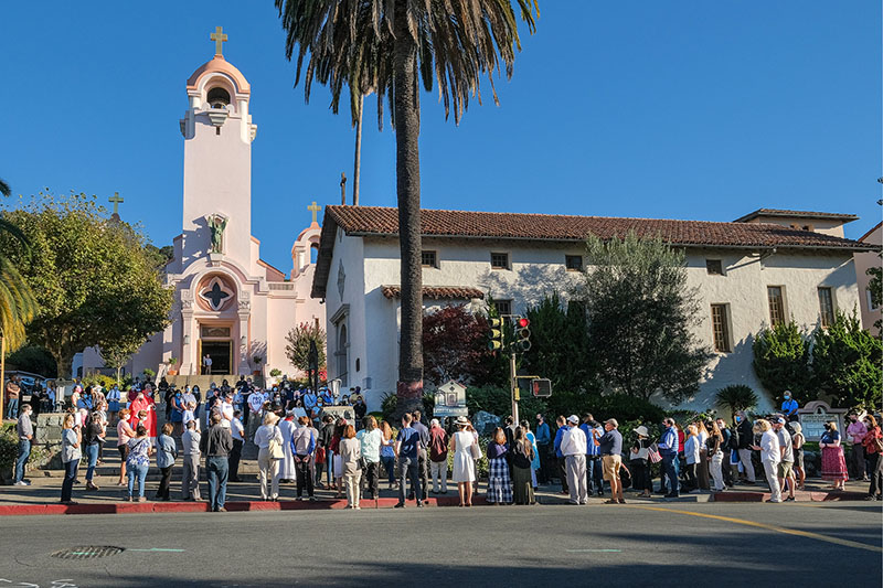 People in San Rafael, Calif., attend an exorcism Oct. 17, 2020, at Mission San Rafael conducted by San Francisco Archbishop Salvatore J. Cordileone. Vandals tore down a St. Junipero Serra statue there Oct. 12. (CNS photo/Dennis Callahan, Archdiocese of San Francisco)