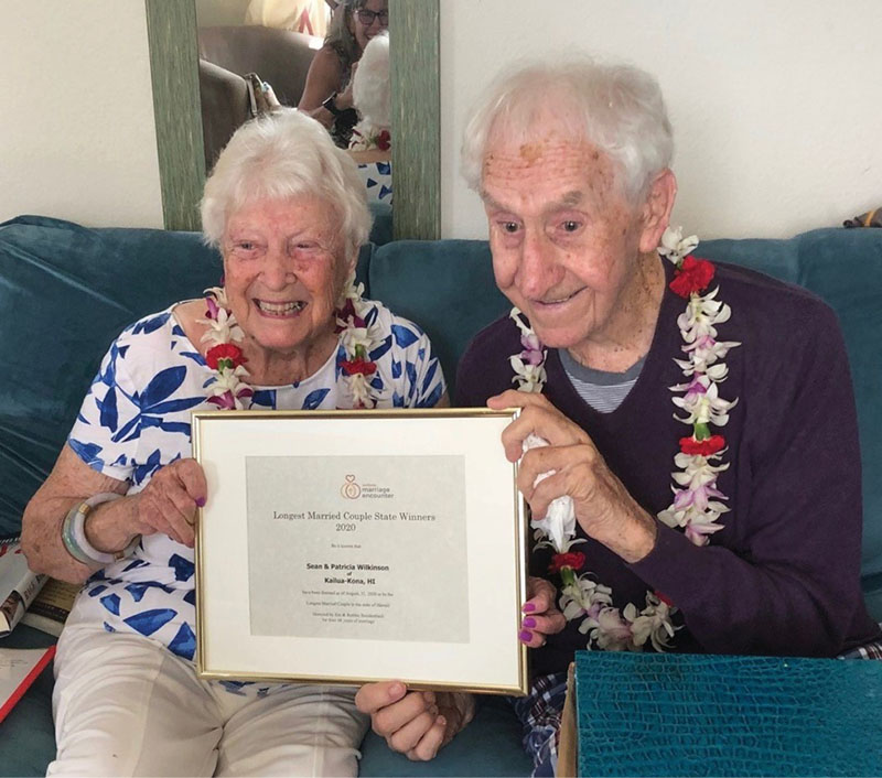 Worldwide Marriage Encounter congratulates Sean and Patricia Wilkinson of Kailua-Kona, Hawaii, recognized as the 2020 longest-married couple in the State of Hawaii. The Wilkinsons, who just celebrated their 69th anniversary on Sept. 4, are members of St. Michael the Archangel Parish in Kailua-Kona.