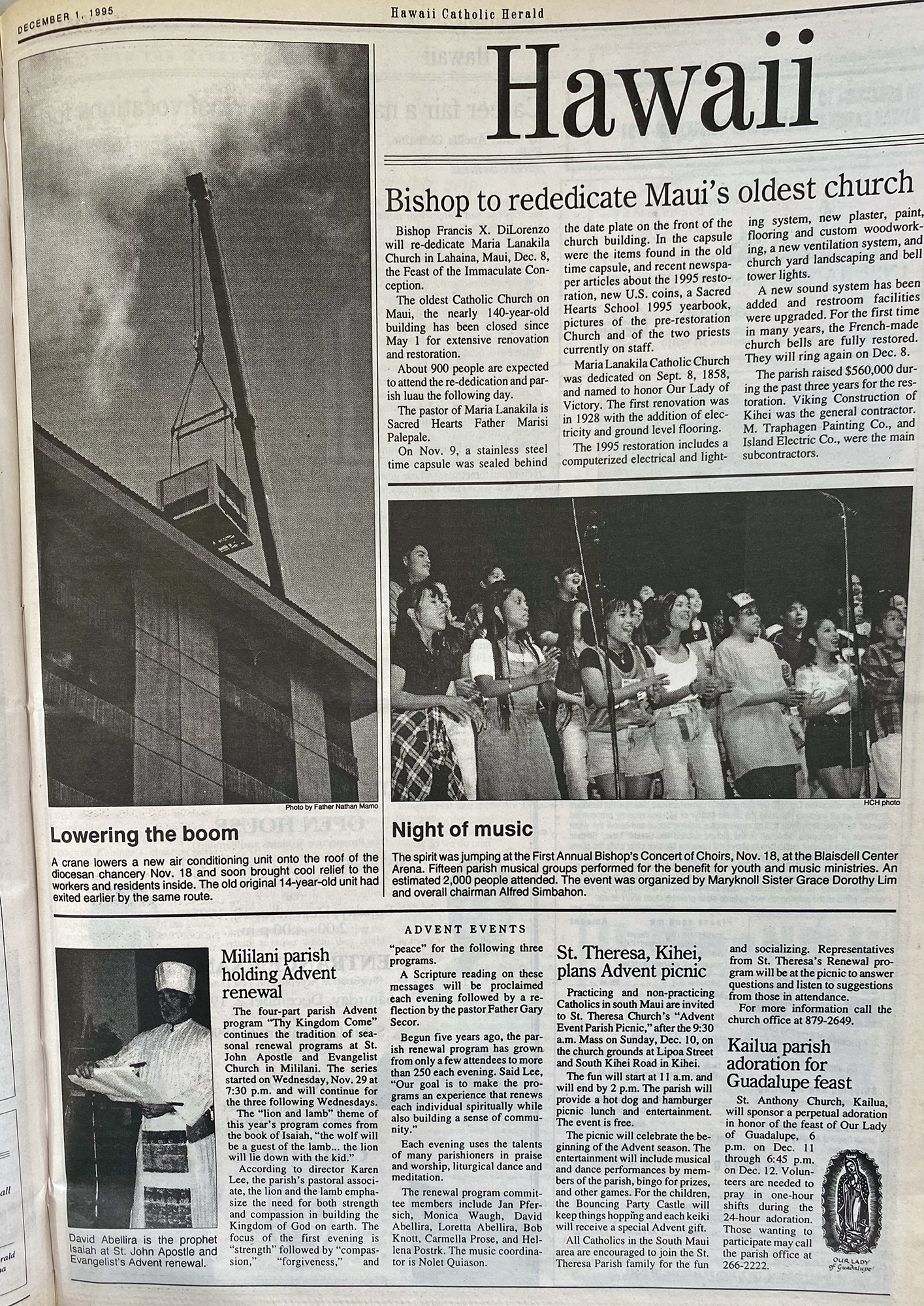 Bishop Francis X. DiLorenzo will re-dedicate Maria Lanakila Church in Lahaina, Maui, Dec. 8, the Feast of the Immaculate Conception.