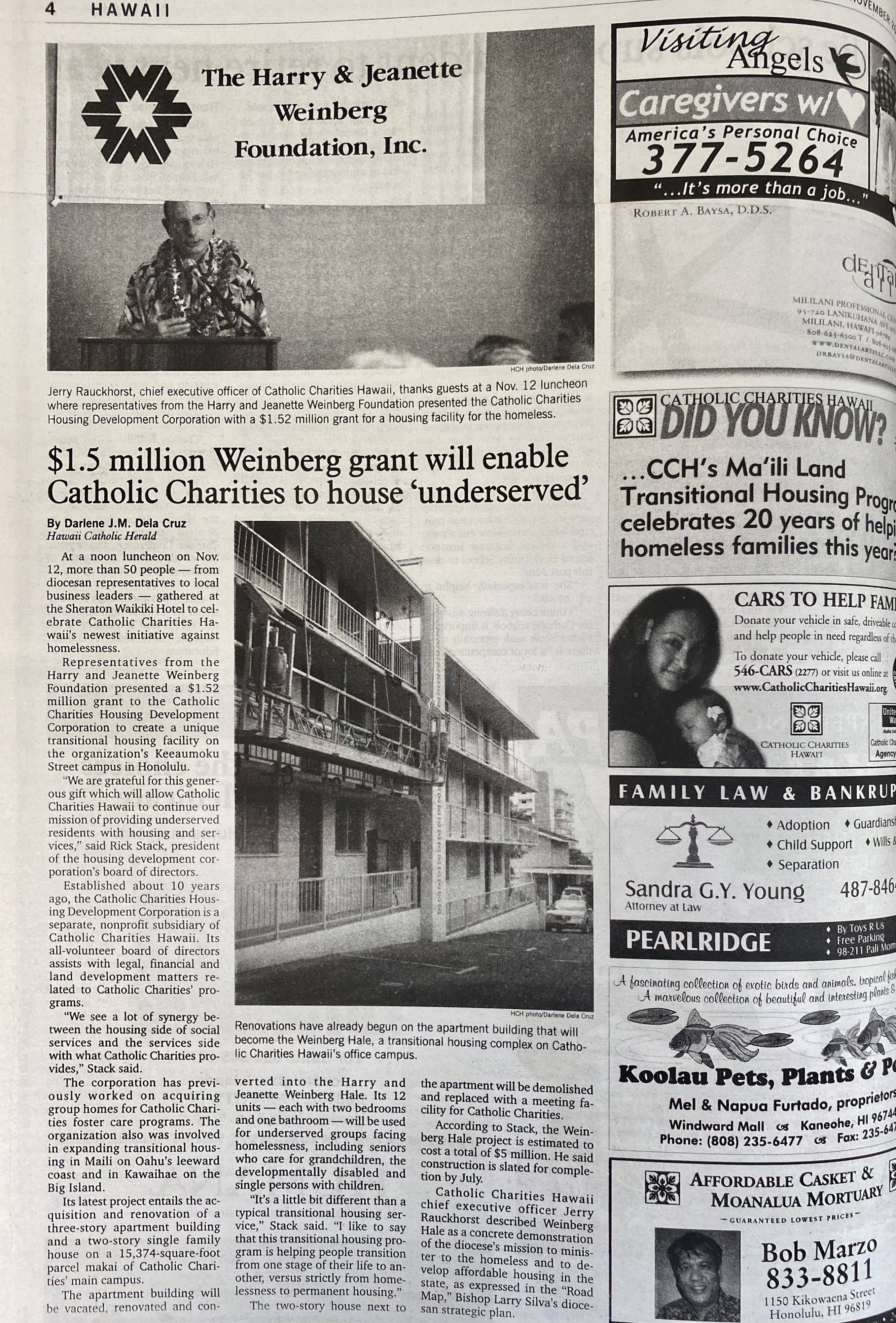 Representatives from the Harry and Jeanette Weinberg Foundation presented a $1.52 million grant to the Catholic Charities Housing Development Corporation to create a unique transitional housing facility on the organizations’ Keeaumoku Street campus in Honolulu. …