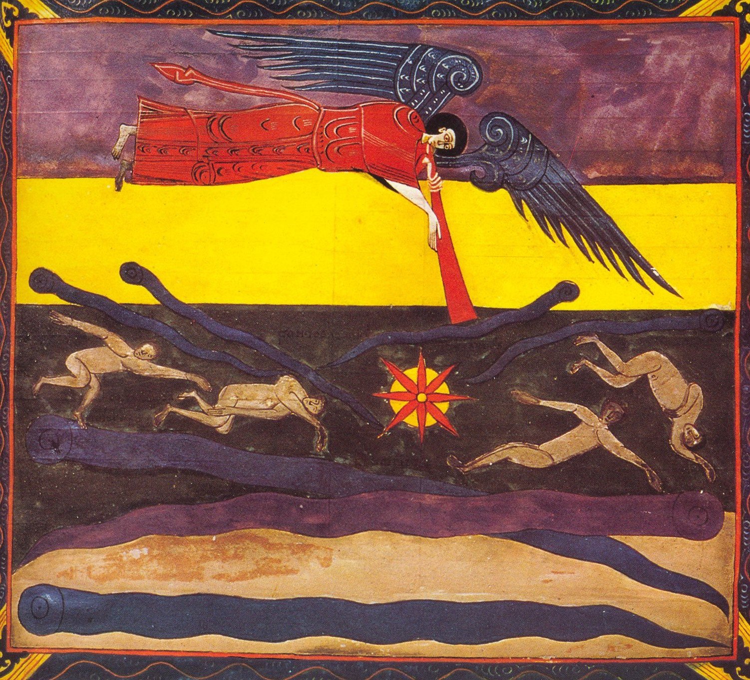 “Behold, I tell you a mystery. We shall not all fall asleep, but we will all be changed, in an instant, in the blink of an eye, at the last trumpet. For the trumpet will sound, the dead will be raised incorruptible, and we shall be changed.” 1 Corinthians 15:51-52. Illumination from Beatus de Facundus, 1047