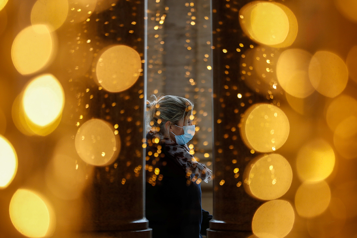 The lights of holiday decorations are seen as a woman wears a mask at a shopping center in Rome Dec. 2, 2020. (CNS photo/Yara Nardi, Reuters)