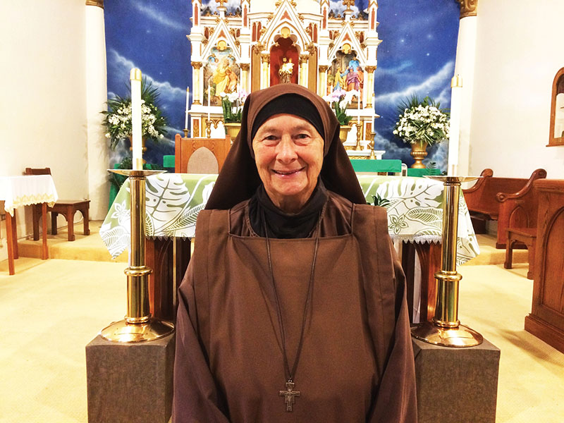Sister Bernadette wears a Franciscan brown habit with a veil, crucifix, scapular and Franciscan waist cord. She’s hard to miss when she goes out, and people often stop to talk. They want to know who she is and what she does. While she happily answers those types of questions, Sister Bernadette especially loves it when someone wants to talk to her about Jesus.