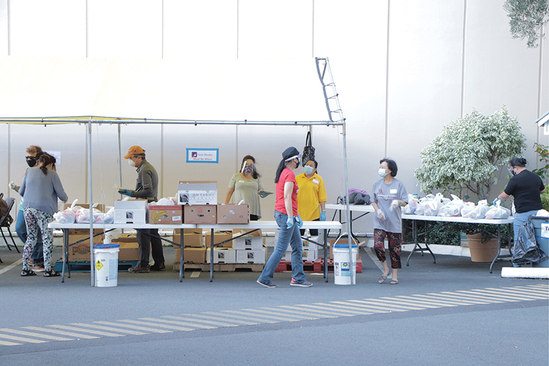 Volunteers at Sts. Peter and Paul Church in Honolulu prepare to distribute free food to persons in need Dec. 30 in the church parking lot. They passed out 150 bags, assisting 50 families and individuals. The next distribution is Jan. 16. (Photo courtesy of Sts. Peter and Paul Church)