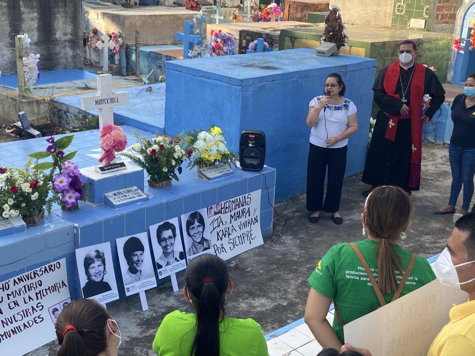 A group of pilgrims gathers near the tomb of Maryknoll Sisters Ita Ford and Maura Clarke Dec. 1, 2020, the eve of the 40th anniversary of their assassination in the Central American nation. Twenty people were on the 2020 list of missionaries killed during the year presented by Fides, the Vatican’s missionary news agency. (CNS photo/Rhina Guidos)